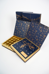 Každé okénko skrývá jednu lahodnou pralinku z jemného nugátu, která potěší i ty nejnáročnější milovníky čokolády. Elegantní balení v temně modrém a zlatém designu z něj dělá nejen výjimečný gurmánský zážitek, ale i krásný dárek pro vaše blízké.
